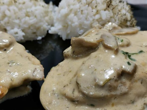 Pomešajte crni luk (u prahu), beli luk (u prahu), ruzmarin, timijan, so i biber. Tom mešavinom začinite meso sa obe strane. U tiganju ispržite meso, pa ga odložite. Zatim u taj tiganj dodajte puter, pečurke iseckane na listiće, pa posolite i pobiberite. Zatim dodajte timijan, ruzmarin, seckani peršun. Na kraju sipajte pavlaku za kuvanje i parmezan, pa prokuvajte 5 -10 minuta.