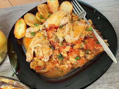 Kad piletina omekša ubaciti na kocke oljušten paradajz, začin, biber, so i na kraju peršunov list..