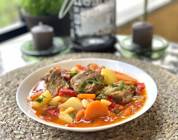 Upržiti na ulju crni luk, šargarepu, paškanat i mladi beli luk. Zatim dodati meso, začiniti po ukusu, preliti sa 50ml vode poklopiti šerpu i ostaviti da se kuva nekih 15 minuta, na umerenoj temperaturi. Nakon toga dodati svežu crvenu papriku, krompir, i paradajz. Sve lepo začiniti, naliti sa 1,5 vode i ostaviti da se kuva 45 minuta.