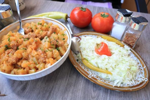 Dodati mlevenu papriku, so, biber i ubaciti seckan krompir. Sve dobro izjednačiti. Servirati toplo uz salatu..Prijatno..