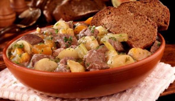 3. U zemljanu posudu slojevito slagati komade mesa, povrća i krompira. Pomešati crno vino, supu, lovor, kleku i timijan i masom preliti meso tako da sve ogrezne u tečnosti.