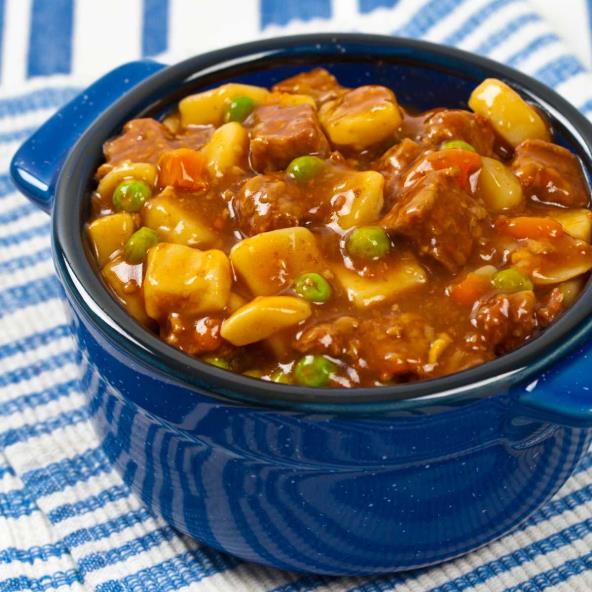 Zagrejte ulje u većem loncu. Zatim meso iseckajte na kockice i polovinu ubacite da se kratko isprži. Posolite i pobiberite i kada bude gotovo izvadite, pa ponovite postupak sa drugom polovinom mesa. Crni luk isecite na kockice, a beli isitnite. Propržite u istom loncu gde ste i meso dok ne dobije zlatnu boju. Dodajte paradajz pire i neka se krčka kratko. Zatim u to dodajte vodu (nekih 2 šolje vode) i vratite meso u lonac. Krompir isecite na krupnije kocke, a šargarepu na pola. Ubacite u lonac zajedno sa lovorovim lišćem i graškom, pa promešajte. Kuvajte dok meso i krompir ne omekšaju. Zatim u šolji pomešajte brašno sa malo vode da napravite zapršku i sipajte u lonac. Kuvajte kratko. Naravno opet sve posolite i pobiberite po želji.