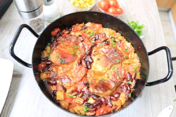 Meso malo izlupajte, pa premažite uljem i malo ih zapecite u tiganju na vrlo malo ulja samo da porumene. Meso možete iseći na kocke, a možete koristiti i cele komade. Luk i papriku isecite na krupno. Sastojke za marinadu dobro izmešajte, pa ubacite meso i povrće koje ste iseckali (sem pasulja i kukuruza). Dobro promešajte, a možete još malo posoliti i pouljiti. Pokriti aluminiskom folijom, pa probušite viljuškom. Pecite na 190°C oko sat vremena. Pred kraj otkriti i dodati pasulj. Vratiti u rernu na nekih 10 minuta. Kuvani kukuruz služiti kao prilog.