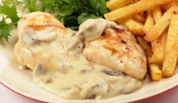 3. Ispržene pileće grudi složiti na tanjir, pa preliti sosom od pečuraka.