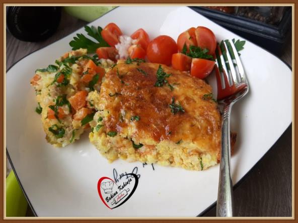 Propržite iseckan crni luk na ulju, pa dodajte šargarepu i tikvicu koje ste isekli na kockice, začin, mleveno meso i to malo izdinstajte. Zatim dodajte opran pirinač i nalijte vodu da ogrezne, pa kuvajte na tihoj vatri da voda provri. Sklonite sa vatre i malo prohladite. U činiji razbijte jaja i dodajte pavlaku, pa promešajte. Sipajte skuvan pirinač i promešajte. Prebacite u podmazan đuveč ili tepsiju, izjednačiti i narendati malo kačkavalja. Pecite u rerni 40 min. na 210°C da lepo porumeni.