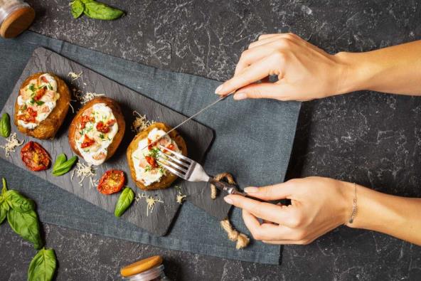 Izrežite krompir na dva dela i izdubite sredinu. Pržite u većoj količini ulja. Propržite crni i beli luk, zatim u jednu veću posudu stavite mlevenom meso, so, biber, proprženi crni i beli luk, jaje, crvenu mlevenu papriku, prezle i peršun. Sve to lepo sjedinite i pravite male ćufte (baš sitne). Stavite krompir u kalup i posolite. U krompir stavite kačkavalj, 2-3 ćuftice (u zavisnosti koliki je krompir). Pomešajte vodu i paradajz pire i time prelijte paradajz. Zatim opet pospite kačkavaljem. Ukrasite polovinom čeri paradajza na vrhu. Pecite 20 minuta na 180°C.