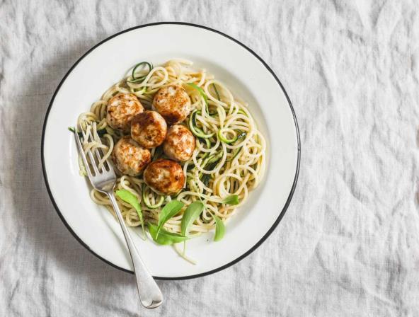 Dodajte nudle od tikvica u tiganj, a zatim sipajte limunov sok. Kratko propržite. Zatim vratite ćuftice u tiganj i pržite kratko da se samo zagreju. Ukrasite sa više parmezana.