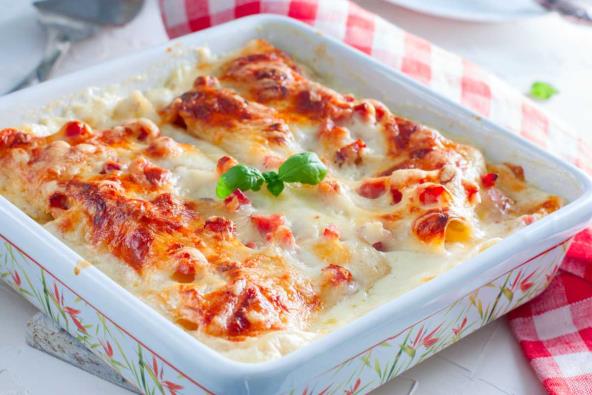 Pripremite posudu u koju ćete ređati sastojke za lazanje. Sipajte par kapi ulja pa poređajte prvi red kora za lazanje. Zatim ide bešamel sos, a preko njega šunku i kačkavalj.