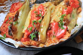 Ostatak paradajza naseći pored paprika. Premazati paprike uljem i peći na 220 stepeni C oko 50-60 min.