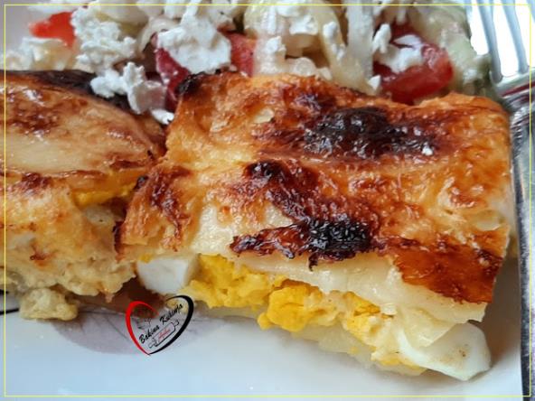 Poređati na dno pola krompira pa iseći na krugove kuvana jaja, posoliti ih. odozgo drugi deo krompira.