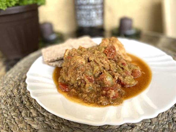 Na zagrejanom ulju propržiti piletinu, malo začiniti. Dodati iseckan crni, praziluk i beli luk. Nakon 15-20 minuta dodati iseckanu papriku, pobiberiti staviti list lovora i naliti malo vode. Nastaviti dinstanje. Dodati i paradajz, i sve ukuvati. Začiniti po ukusu. Za kraj dodati umućeno jaje, prijatno!