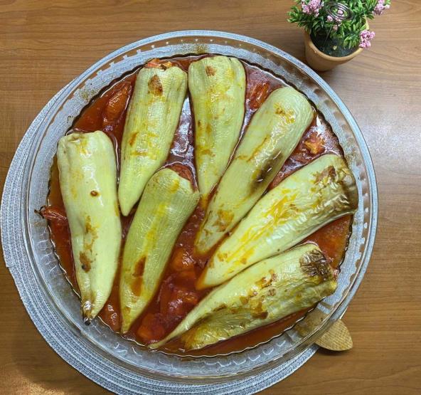 Na ulju propržiti crni luk, zatim dodati beli luk. Ubaciti i šargarepu, nastaviti prženje. Zatim staviti meso i začiniti po ukusu. Dodati pirinač i sveži peršun. Lepo sjediniti fil. Paprike puniti, zatvarati parčićima paradajza. Poređati po tepsiji. Rastvoriti paradajz pelat preliti preko paprika, izmeđšu staviti paradajz. Peći na 200 stepeni 20 do 25 minuta. Prijatno!