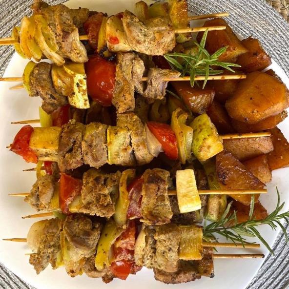 U iseckane i posoljene šnicle dodati kašiku maslinovog ulja i tri kašike senfa i malo majorana. Sve sastojke sjediniti. Svo povrće iseckati na malo krupnije kockice. Redjati po želji na štapiće. Pržiti na umerenoj temperaturi sa vrlo malo ulja. Prijatno!
