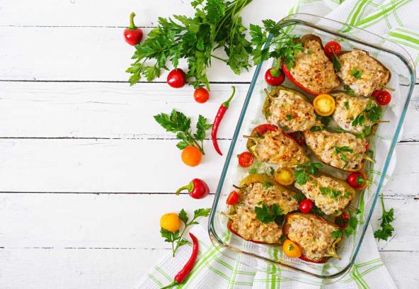 Belo meso isecite na kockice i stavite u posudu. Zatim ih začinite sa solju, biberom, origanom, belim i crnim lukom u prahu i ruzmarinom. Lepo promešajte da sjedinite. Ubacite meso u brašno, jaja i prezle, pa ispecite u rerni na 200°C nekih 25 minuta. Paprike presecite na pola i izvadite semenke. U svaku papriku kašiku paradajz soka i preko kašiku parmezana. Zatim dodajte piletinu, pa opet paradajz sok i parmezan. Sve to prekrijte sa mocarelom. Pecite u rerni nekih 25 minuta na 200°C.