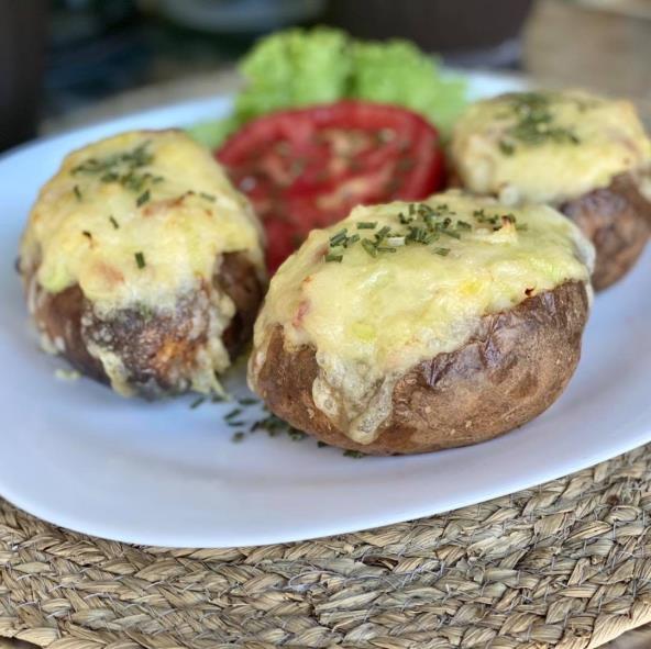 Krompir staviti u pleh dobro posoliti i peći na 200 stepeni 45-50min. Dok se krompir peče prepržiti slaninicu, bez ulja, dok ne postane hrskava. Ispečene krompire zaseći dužinski. Izdubiti ih, i krompir koji izvlačimo odvajati u činiju. U tu smesu dodati puter, slaninicu, malo kačkavalja i pavlaku. Po želji posoliti. Sjediniti smesu pa puniti opne krompira. Odozgo staviti kačkavalj. Vratiti u rernu da se zapeče, oko 10ak minuta. Prijatno!