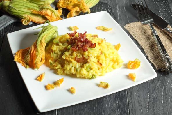 Tikvicu oljuštite i iseckajte na kockice, a iseckani crni luk i šargarepu propržiti na malo ulja, pa zalijte sa malo supe od povrća. Ostavite da se prodinsta, pa dodajte tikvice. Kada tikvice omekšaju dodajte pirinač, još supe i ostavite da se dinsta. Isečenu slaninu propržite u tiganju bez ulja i kad porumeni dodajte u pirinač. Dinstajte dok pirinač ne omekša.