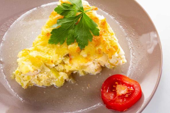 Tikvice iseckajte na kockice i posolite. Piletinu isto iseckajte na kockice i dodajte u posudu gde su tikvice. Dodajte jaja i malo soli, bibera i pavlake. Lepo promešajte i sipajte u nauljenu tepsiju. Pecite na 180°C 30 minuta. Izvadite iz rerne i dodajte malo narendanog kačkavalja. Pecite još 10 minuta.
