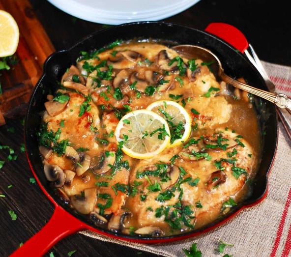 Isecite pečurke na listiće i potopite u vodu zakiseljenu limunom. Propržite karabatak (ili deo piletine po želji) na ulju sa sitno seckanim belim lukom. U pola prženja dodajte pečurke, posolite, pobiberite i dodajte malo rendane kore limuna. Pustite da se dinsta na srednjoj temperaturi. Na kraju dodajte vino, sok od limuna i sitno seckan peršun, pa ostavite još kratko da se dinsta.