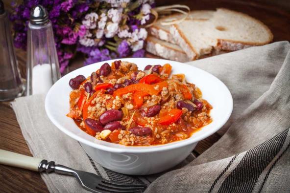 U velikom loncu na srednje jakoj vatri propržite mleveno meso. Dodajte seckan crni luk, papriku iseckanu na kockice i iseckanu ljutu papričicu i kuvajte dok ne omekša (dolijte malo vode ako je potrebno). Zatim dodajte sitno seckan beli luk i kuvajte još minutu. Začinite čilijem u prahu, kuminom, pa posolite i pobiberite. Dodajte malo paradajz paste i pasulj sa sve tečnošću. Zatim sipajte pelat (usitnite malo pelat) i malo vode, pa sve promešajte. Brašno pomešajte sa vodom i dodajte u gulaš zajedno sa sirćetom. Kuvajte još nekih 45 minuta.