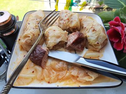 Priprema: Na ulju propržite seckan crni luk, dodajte crvenu mlevenu papriku, mleven biber, sitno seckan beli luk, malo ljute tucane paprike i sklonite sa šporeta. Dodajte mleveno meso i opran pirinač i sve dobro promešajte, pa sve zajedno malo propržite. Ubacite po želji 1. jaje. Listovima kupusa odstranite tvrdi deo i stavite na sredinu kašiku fila, pa rukama malo izdužite i savijte ivice kupusa, pa uvijte sarmu malo nadugačko. Ređajte u šerpu uz ivice uspravno i dobro pritisnite jednu uz drugu. U sredinu stavite isečena rebra i isečenu sredinu kupusa. Dodajte lovorov list i neko zrno bibera po želji. Pospite još malo tucanom paprikom i nalijte vodom da ogrezne. Kuvajte oko 2,5 sata na tihoj vatri. Ukoliko je kupus prekiseo obavezno operite listove.
