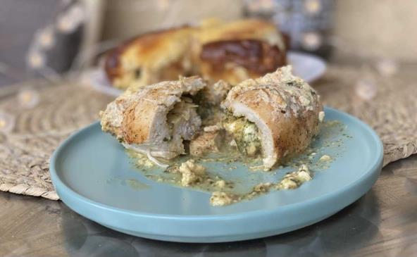 Piletinu lepo začinite. U senf dodajte sveži ruzmarin. Premažite preko piletine, zatim dodajte pire od spanaća i gorgonzolu. Uvijte u rolnice. Preliv umutite i sipajte preko piletine. Pecite na 200°C 25-30 minuta.