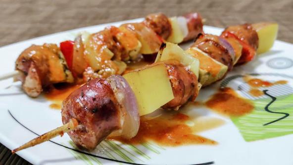 Isecite povrće na kockice, a kobasicu na veće kolutove. Stavite redosledom kojim želite na štapić za ražnjiće. Ostatak povrća stavite u nauljen pleh, dodajte preko ražnjiće, posolite, pobiberite i dodajte mešavinu italijanskog začina. Preko toga sipajte bujon ili vino. Pecite na 180°C 60 minuta poklopljeno i još 15 minuta otklopljeno. Izblendirajte ostatke u plehu i prelijte preko ražnjića.
