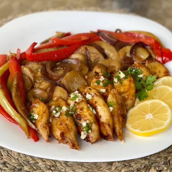 Povrće iseći i začiniti po ukusu, zatim ga pržiti na maslinovom ulju 10-12 minuta. Zatim povrće izvaditi i u isti tiganj staviti lignje. Dodati soja sos i suvi zacin. Prziti oko 10 minuta. Preliv za lignje napraviti tako sto cemo iseci beli luk i peršun, ocediti polovinu limuna, sve sjediniti i dodati maslinovo ulje i malo soli. Prijatno!