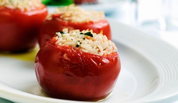 3. Zagrejati rernu na 200 stepeni. Paradajz oprati, obrisati, sa svakog skinuti poklopac i izdubiti plod. Izdubljen mesnati deo ploda ispasirati, pa staviti u podmazanu tepsiju. Unutrašnjost izdubljenog paradajza posoliti i pobiberiti, pa ispuniti masom sa pirinčem. Na svaki punjeni paradajz staviti tanak listić maslaca, pa poklopiti poklopcem . Punjeni paradajz peći u rerni 15 minuta. Po želji ukrasiti začinskim biljkama.