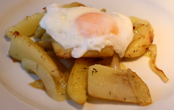 Zagrejte ulje u tiganju i ubacite krompir isečen na kriške. Pržite nekih 5 minuta. Dodajte krupno sečen crni luk i pržite još 15 minuta. Nakon tog vremena posolite i sipajte sušeni ruzmarin. Razbijte jaje u posudi, a šerpu napunte vodom i stavite da proključa. Zatim napravite vir nekom kašikom i ubacite jaje u taj vir. Izvadite posle 2 minuta. Tako uradite sa svakim jajetom. Servirajte sa krompirom i lukom.