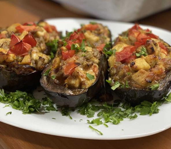 Patlidžan iseći na polovine i izdubiti. Zapeći u rerni. Delove koje smo izvadili iseći na sitne kockice i propržiti na ulju zajedno sa piletinom, paradajzom i lukom. Sjediniti tu masu sa kačkavaljem pa puniti izdubljene patlidžane. Vratiti u rernu da se zapeče 10-15 minuta. Po želji posuti peršunom. Prijatno!