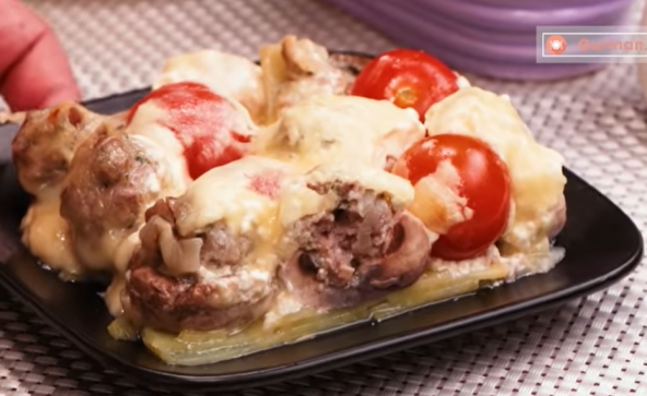 Oljuštite krompir i operite i izrendajte na tanke krugove. U tepsiju dimenzija 21x32 cm poređajte sav krompir u nekoliko redova. Zagrejte ulje u tiganju i dodajte seckan crni luk. Proprženi luk dodajte u mleveno meso, a u drugu posudu stavite tost i prelijte mlekom. Zatim izdrobite rukama. I hleb dodajte u meso, kao i so, biber, peršun, beli luk u prahu i rukama lepo sjedinite celu smesu. Preko krompira poređajte očišćene pešurke. Od smese sa mesom pravite male ćufte i ređajte u pečurke. Između pečuraka stavite čeri paradajz. U posudi pomešajte kajmak, jaje, pavlaku za kuvanje i so, pa dobro umutite žicom. Prelijte preko jela. Pecite na 190°C nekih 20 minuta. Stavite preko rendani kačkavalj i vratite u rernu na 180°C nekh 15 minuta.