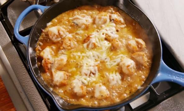 U velikom tiganju ugrejte ulje. Dodajte luk isečen na trake i posolite, pobiberite i začinite majčinom dušicom. Kuvajte dok se luk ne karamelizuje, oko 25 minuta. Zatim dodajte sitno seckan beli luk i kuvajte dok ne zamiriše, još minut. Isključite i sklonite luka iz tiganja. Obrišite ga, pa opet sipajte malo ulja. Iseckajte piletinu na kockice, posolite, pobiberite i dodajte origano. Potom preko sipajte brašno i promešajte. Ispržite piletinu, pa dodajte bujon i luk. Pustite da proključa, a zatim smanjite temperaturu i dinstajte dok se piletina ne skuva i bujon malo ispari. Dodajte kačkavalj i poklopite tiganj. Dinstajte dok se sir ne otopi, oko 2 minuta. Skinite sa vatre i ukrasite peršunom pre služenja.