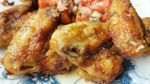 Posoljena krilca provucite kroz brašno i ulje sa začinima i ređajte u podmazan pleh. Pecite na 220°C oko 50 min. da lepo porumene. Izvadite iz masnoće i služite toplo.