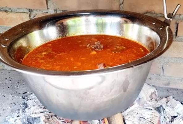 Dodajte i meso: kobasicu, slaninu i suvo meso. Dodajte još 2 l vode i promešajte. Ako zafali slobodno sipajte još malo vode. Kuvajte nekih 3 sata, a pred sam kraj dodajte malo suvog začina ili soli.