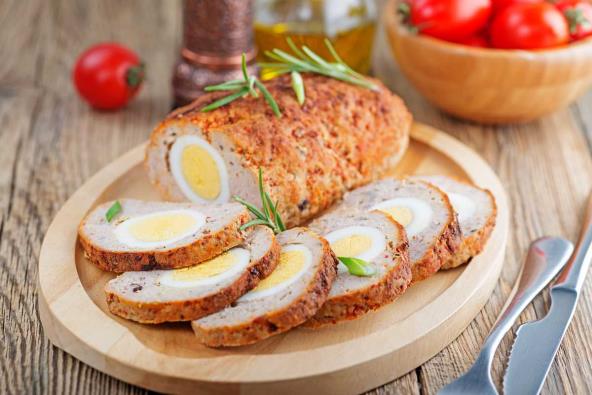 1. U mleveno meso dodamo 2 kašike prezli. Dobro izmešamo. Na aluminijsku foliju razvaljamo meso i složimo na njega kuvana jaja.