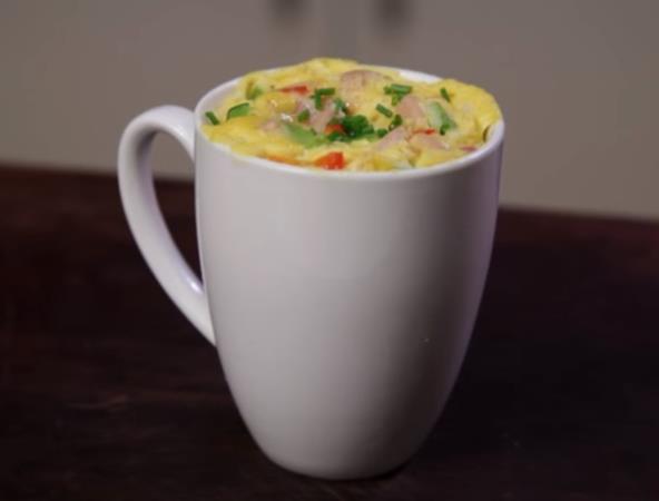 Šunku i paprike iseckajte na kockice, a kačkavalj izrendajte. U šolju sipajte jaja, pa dodajte papriku, šunku i kačkavalj. Zatim sipajte pavlaku za kuvanje i promešajte da se lepo razbiju jaja. Posolite i pobiberite.