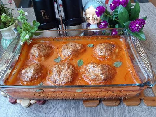 Ubaciti malo origana, bosiljka seckanog i soli. U tepsiju sipati sos i unutra poređati ćuftice. Premaziti uljem i peći u rerni na 210 stepeni oko 30-40 minuta.