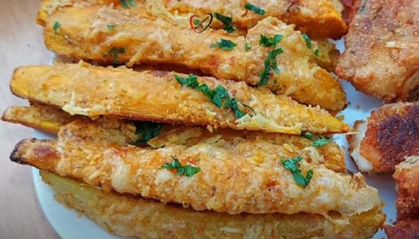 Izmešati oba brašna pa uvaljati batat i poređati u tepsiju i posuti kaškavaljem.
