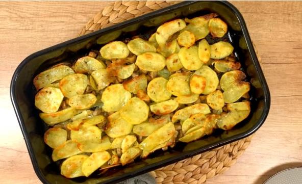 Krompir isecite na tanke kriške. Stavite ga u veću činiju i začinite sa biljnim začinom, biberom i uljem. Nakon toga, krompir rasporedite po podmazanoj tepsiji. Preko krompira rasporedite dinstane šampinjone, pa preko poređate još jedan red krompira.