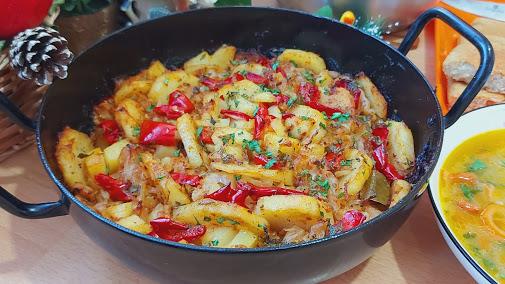 Krompir iseći na kolutove, pouljiti, dodati malo crvene paprike i belog luka u granulama pa uglaviti izmedju kupusa nakoso. Staviti u rernu još 20-30 min da se zapeče.