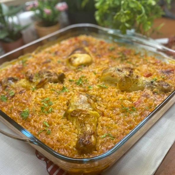 Na ulju propržiti povrće, dodati začine temeljac pa zatim ubaciti batake, malo ih propržiti i izvaditi. U povrće dodati 150-200ml paradajz sosa i upržiti. I na kraju pirinač. Sve promešati i presuti u posudu za pečenje, dodati i batake i peći na 180 stepeni 25-30 minuta. Prijatno!