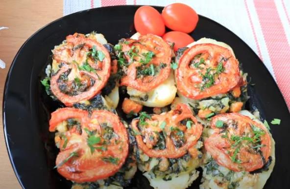 Sve izmešati. Krompir oguliti preseći na pola pa ga izdubiti. Izdubljen deo krompira malo viljuškom izdrobite pa ubacite u spanać izmešajte i punite krompir.
