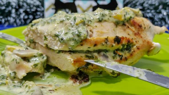 Napravite džepove na pilećem fileu, zasecite po sredini, ali ne do kraja. Napunite deo sosom, i čačkalicama zatvorite otvore. Pržite meso na srednjoj vrati. Okrećite sa svih strana.