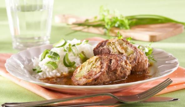 1. Šnicle oprati, osušiti, posoliti i pobiberiti. Premazati senfom, prekriti sa po 1 režnjem slanine. Začinsko bilje oprati, polovinu sitno iseckati, pa pomešati sa jajima i svežim sirom. Crni i beli luk oljuštiti, sitno iseći, pa pola od svakog dodati u masu sa kremom. Začiniti solju, biberom i muskatom, umešati prezle i time premazati šnicle. Meso urolovati i pričvrstiti čačkalicama.