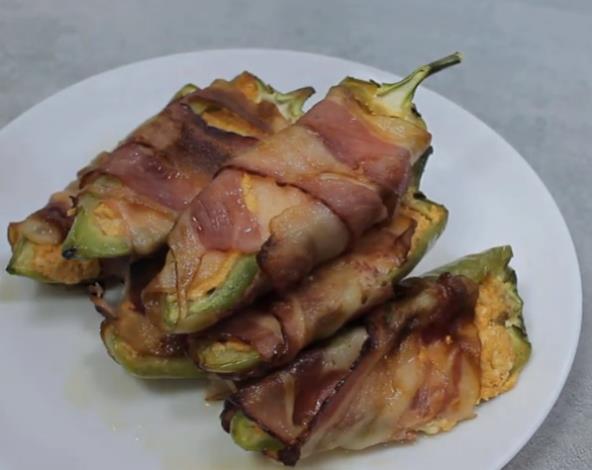 Paprike presecite na pola i očistite. Fetu izdrobite, dodajte tucanu i slatku papriku, kao i beli luk. Promešajte. Napunite paprike urnebes salatom i obmotajte slaninu oko svake. Stavite u pleh obložen pek papirom i pecite u rerni na 200°C nekih 15 minuta.