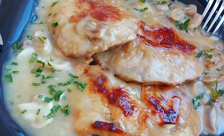 Pržiti da porumeni pa uliti 200 ml belog vina i 200 ml vode. Ubaciti seckane šampinjone, dodati so, biber i vratiti šnicle u tiganj da se krčkaju sa šampinjonima. Poklopiti.