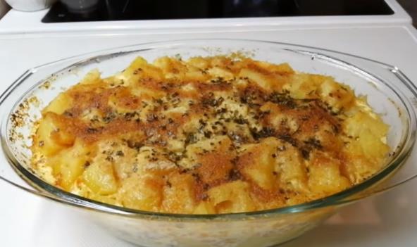 Krompir iseckajte na kockice i polovinu stavite u vatostalnu posudu. Preko sipajte meso, pa poređajte ostatak krompira. Ulupajte jaja, pa dodajte mleko i vodu. Sve promešajte i prelijte preko jela. Preko pospite prezle i vlašac. Poklopite i pecite u zagrejanoj rerni na 200°C 40 minuta.