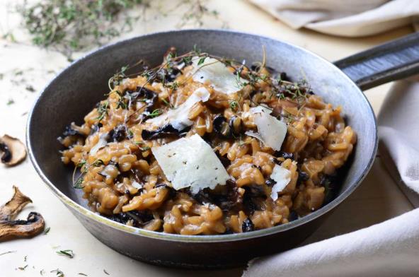 Servirajte rižoto, odozgo salata od rukole, pa na kraju pržene pečurke.