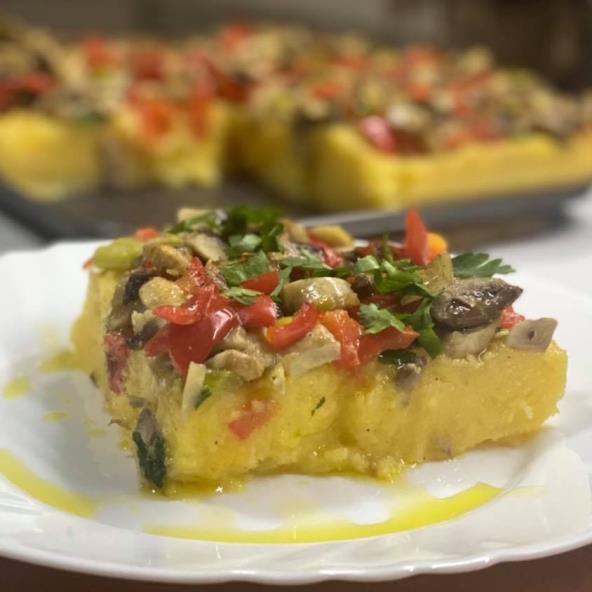 Palentu skuvati u vodi u koju smo dodali so i maslinovo ulje. Presuti u podmazani kalup. Povrće iseći i propržiti na malo ulja. Staviti preko palente i zapeći u rerni 8-10 minuta. Po želji posuti peršunom i maslinovim uljem. Prijatno!