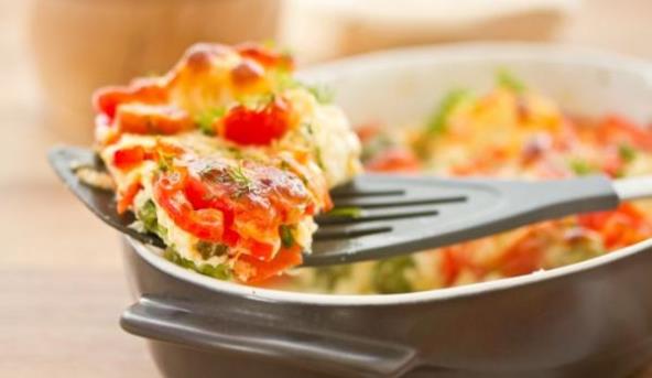 3. Izmešati pripremljene sastojke, posoliti i pobiberiti po ukusu. Poređati povrće u nauljeni pleh, posuti ga maslacem iseckanim na komadiće i peći oko 20 minuta.